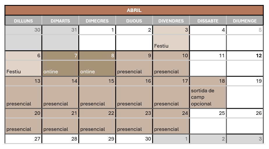 • Inclou classes a l’aula, pràctiques de SIG i treball de camp (9 i 10 d’abril i del 13 al 17 d’abril).