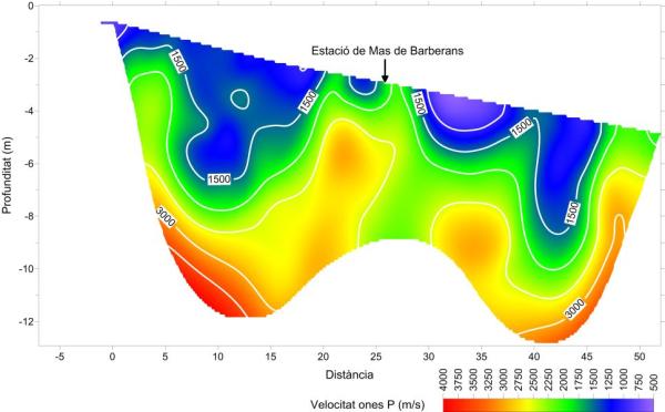 El model de velocitat de les ones P obtingut mitjançant la tomografia sísmica aporta informació del comportament del subsòl fins a 10 metres de profunditat. S’observa una primera capa d’un espessor variable, entre 2 i 6 metres, amb una velocitat inferior a 2500 m/s. Aquests valors de velocitat corresponen a materials “ripables” i es poden relacionar amb roca fracturada o meteoritzada. Fins i tot en alguns sectors la velocitat és inferior a 1500 m/s, que s’associa a un material poc compactat, i en algun punt arriba fins a 4 metres de fondària. Per sota dels 8 ó 10 metres de fondària se superen els 3000 m/s, valors que es relacionen amb roca sana no “ripable”.