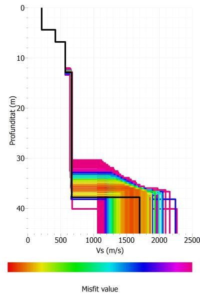 A partir de l’anàlisi de la dispersió de les ones superficials Love (MASW) s’ha pogut calcular el perfil vertical de la velocitat de propagació de les ones de cisalla (Vs). S’hi identifiquen tres capes. Al sector del pou sísmic s’observa una capa superficial amb una velocitat d’uns 250 m/s d’uns 5 metres de gruix. Per sota d’aquesta la velocitat augmenta lleugerament fins a uns 600 m/s. A 36 metres aproximadament hi ha una capa d’alta velocitat, amb valors propers a 1500 m/s. Aquesta darrera capa s’interpreta com el basament rocós.