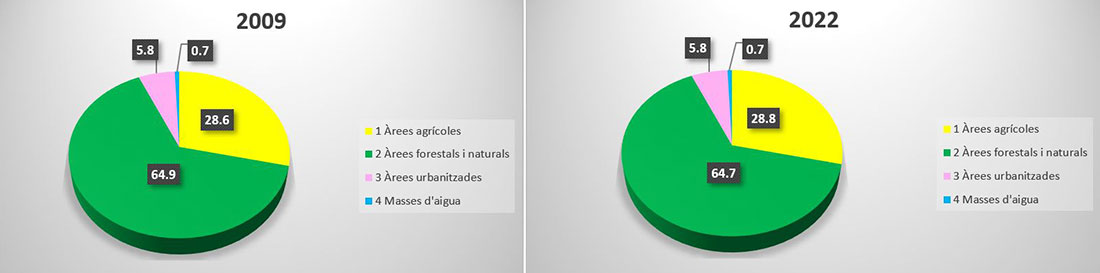 - Forest and natural areas cover 64.7% of Catalonia, while agricultural and urban land gains ground, between 2009 and 2022.