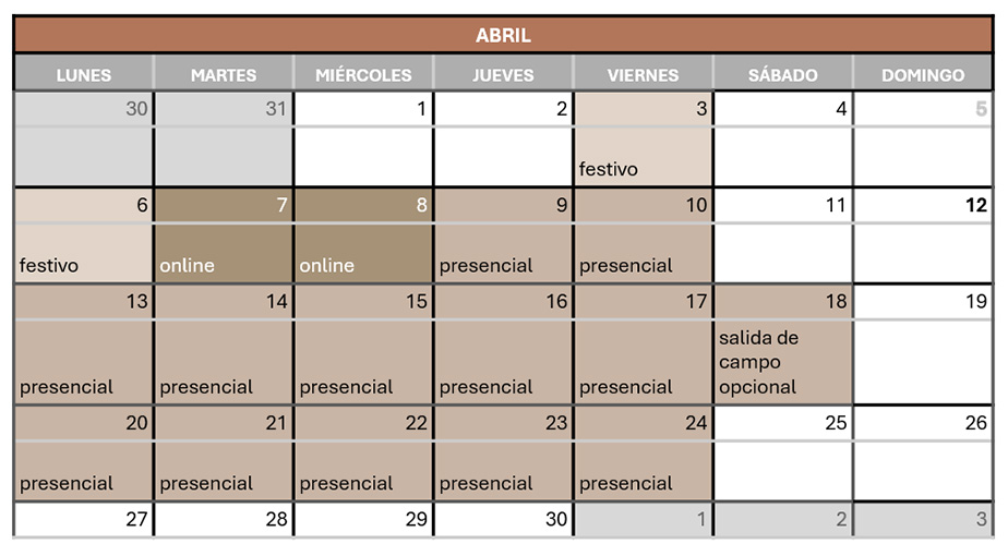 - Incluye clases en el aula, prácticas de SIG y trabajo de campo (9 y 10 de abril y del 13 al 17 de abril).