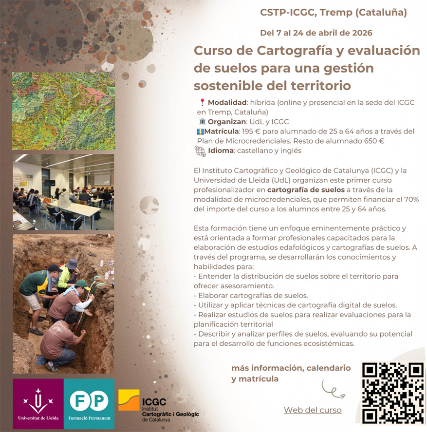 Por ello, desde la Universidad de Lleida (UdL) y el Instituto Cartográfico y Geológico de Cataluña (ICGC), a través del programa de microcredendiales, proponemos por primera vez un curso eminentemente práctico, que combina clases teórico-prácticas con un intenso trabajo de campo, ya que la base de la cartografía de suelos reside en un conocimiento sólido y contrastado sobre el terreno. Las salidas de campo y las actividades del curso seguirán la lógica real del proceso de elaboración de un mapa de suelos, desde la recopilación de la información disponible y la construcción de la relación suelo-paisaje, hasta la diferenciación de los distintos tipos de suelo y la generación de todas las capas de información en un sistema de información geográfica (SIG). El curso tiene un claro carácter profesionalizador y se evaluará mediante un trabajo en grupo que consistirá en la elaboración de un mapa de suelos real de una zona concreta de la Conca de Tremp, donde se desarrollará la formación. Asimismo, se visitará la comarca de la Cerdanya para observar suelos bajo distintos regímenes de temperatura y humedad y conocer la diversidad edáfica de Cataluña, y se recorrerá la colección de monolitos de suelos del Centre Territorial de los Pirineos del ICGC en Tremp, sede del curso.