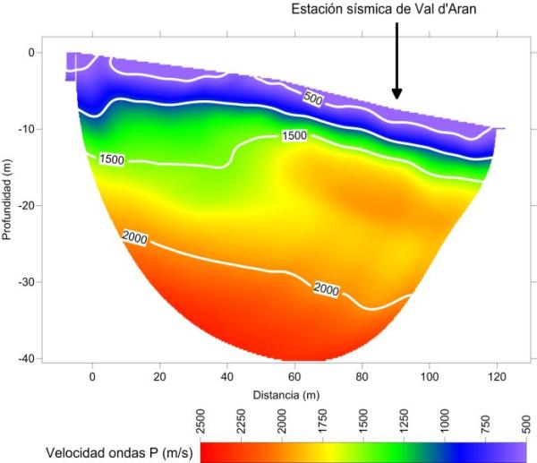 A partir del análisis de la dispersión de las ondas superficiales Love (MASW) se ha podido calcular el perfil vertical de la velocidad de propagación de les ondas de cizalla (Vs). Se identifican tres capes. En el sector del pozo sísmico se observa una capa superficial con una velocidad de unos 250 m/s de unos 5 metros de espesor. Por debajo de ésta la velocidad aumenta ligeramente hasta unos 600 m/s. A 36 metros aproximadamente hay una capa de alta velocidad, con valores cercanos a 1500 m/s. Este última capa se interpreta como el basamento rocoso.